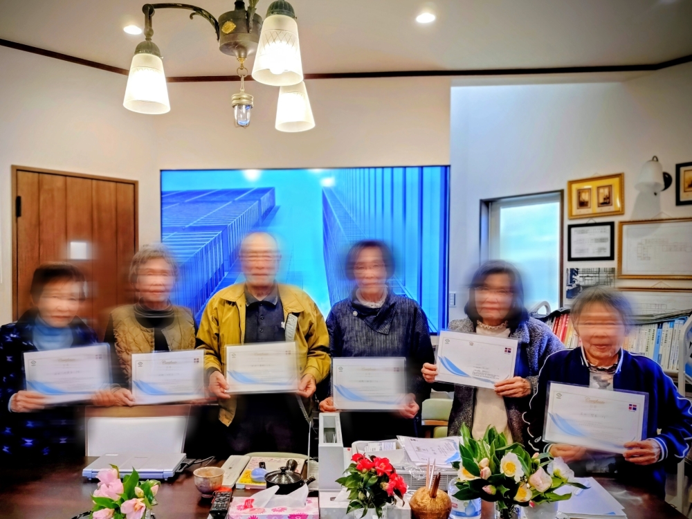 10月から開講した「在宅セフルケア講座」は修了しました。修了証をお渡ししました。76歳から87歳の方々がご自身の日々の健康な生活のための知恵を互いに共有しました。皆様方は地域の高齢者の会の役員をなさっておられるので、既に多くの知恵を活用しておられました。全員がお元気に修了できてよかったです!